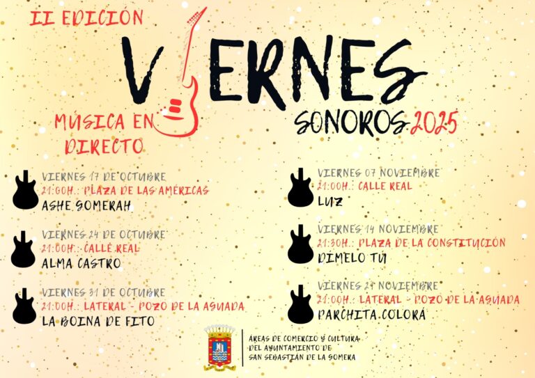 El Ayuntamiento de San Sebastián de La Gomera, a través de la Concejalía de Comercio y de la Concejalía de Cultura, celebra la segunda edición de los «Viernes Sonoros», que contará con la actuación en directo de seis grupos y solistas gomeros y de otros rincones del archipiélago, desde el 17 de octubre hasta el 21 de noviembre. Estos conciertos se celebrarán en distintos escenarios del centro histórico de la capital gomera, fusionando cultura, ocio y dinamización comercial.